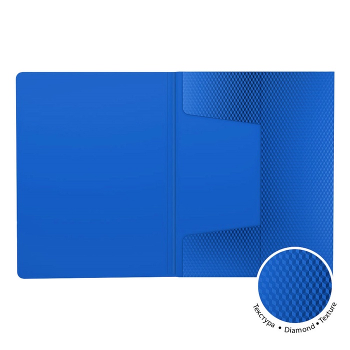 Папка на резинках формата A4 из высококачественного пластика с текстурой поверхности "диагональ", на которой не видно отпечатков пальцев и мелких царапин.