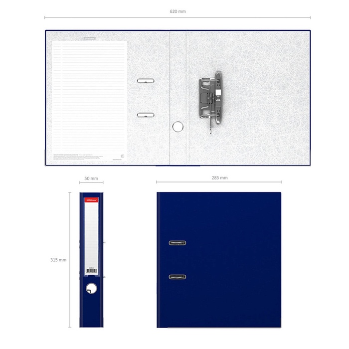 Папка - регистратор формата А4 снабжена стальным арочным механизмом с никелевым покрытием. Изготовлена из плотного картона толщиной 2 мм, покрытого специальным износостойким материалом с фактурным тиснением. Корешок папки шириной 50 мм оснащен прозрачным пластиковым карманом со сменной этикеткой для маркировки. Для удобства использования на корешке имеется металлическое кольцо для захвата. Нижние края обложки защищены металлическим кантом. Металлические фиксаторы удерживают папку в закрытом виде даже при максимальном наполнении. Вместительность до 350 листов бумаги плотности 80 г/м². На форзаце есть шаблон для оглавления.