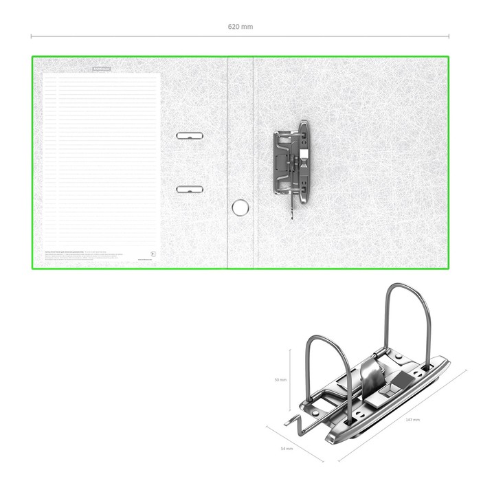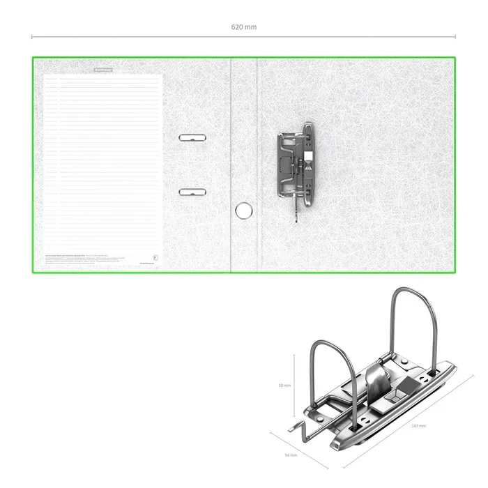 Папка - регистратор формата А4 снабжена стальным арочным механизмом с никелевым покрытием. Изготовлена из плотного картона толщиной 2 мм, покрытого бумагой со структурным тиснением и водоотталкивающей поверхностью. Корешок папки шириной 50 мм оснащен прозрачным пластиковым карманом со сменной этикеткой для маркировки. Для удобства использования на корешке имеется металлическое кольцо для захвата. Металлические фиксаторы удерживают папку в закрытом виде даже при максимальном наполнении. Вместительность до 350 листов бумаги плотности 80 г/м. На форзаце есть шаблон для оглавления. Коллекция представлена в ярких неоновых цветах.