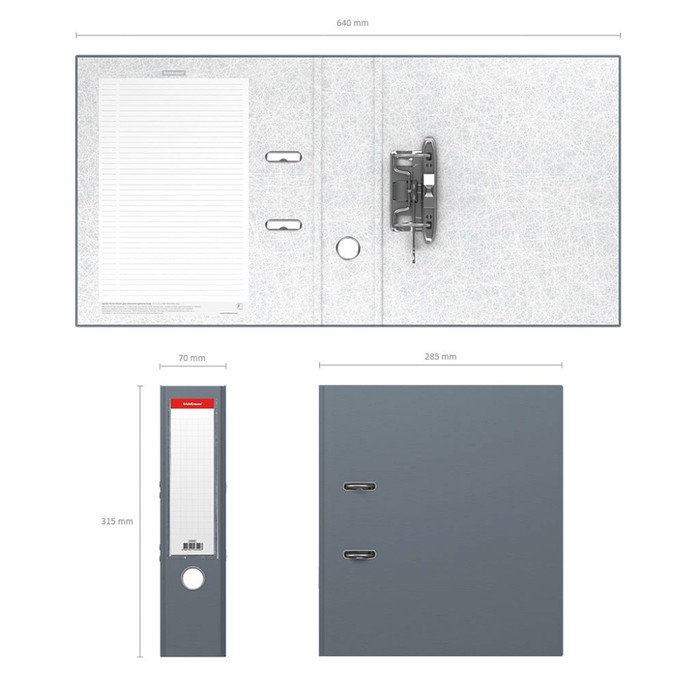 Папка - регистратор формата А4 снабжена стальным арочным механизмом с никелевым покрытием. Изготовлена из картона толщиной 1.75 мм, покрытого специальным износостойким материалом с фактурным тиснением. Корешок папки шириной 70 мм оснащен прозрачным пластиковым карманом со сменной этикеткой для маркировки. Для удобства использования на корешке имеется металлическое кольцо для захвата. Металлические фиксаторы удерживают папку в закрытом виде даже при максимальном наполнении. Вместительность до 450 листов бумаги плотности 80 г/м². На форзаце есть шаблон для оглавления.