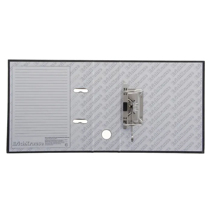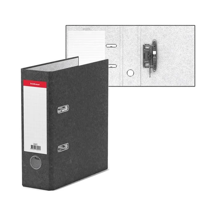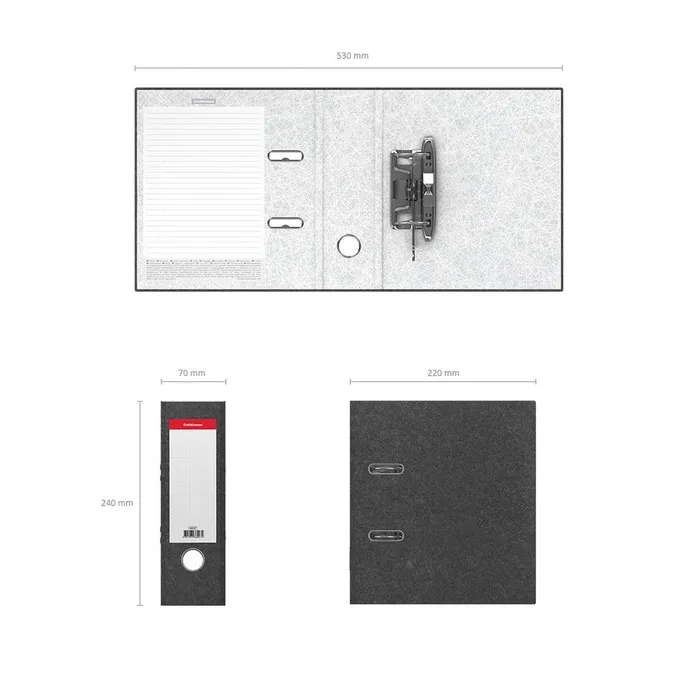 Папка - регистратор А5 снабжена стальным арочным механизмом с никелевым покрытием. Изготовлена из плотного картона толщиной 2 мм, покрытого износостойкой бумагой с фактурой «под мрамор» и водоотталкивающей поверхностью. На корешок шириной 70 мм наклеена этикетка для маркировки. Для удобства использования на корешке имеется металлическое кольцо для захвата. Металлические фиксаторы удерживают папку в закрытом виде даже при максимальном наполнении. Вместительность 450 листов бумаги плотности 80 г/м². На форзаце есть шаблон для оглавления.