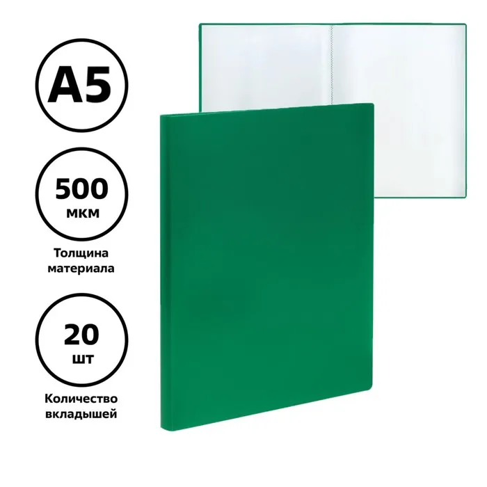 Зелёная папка с вкладышами А5 — это ваш идеальный помощник для организации документов. Изготовленная из плотного пластика толщиной 500 мкм, она сочетает надёжность и функциональность. Внутри — 20 удобных файлов, эффективно распределяющих ваши бумаги. Природный зелёный цвет придаёт изделию приятную натуральность.