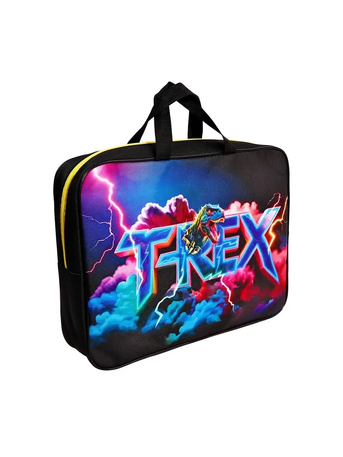Текстильная папка-портфель Calligrata TOP «Динозавр» — удобный органайзер формата А4 для юных любителей древних ящеров. Чёрный фон с ярким принтом сочетает практичность и индивидуальный стиль.