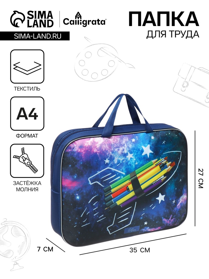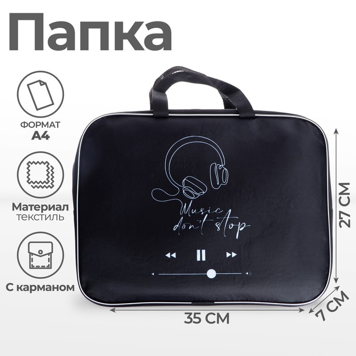 Папка текстильная на молнии с ручками, формат A4+. Размер 270 х 70 х 350 мм. Материал: износо-морозостойкий водоотталкивающий 100% полиэстер. Предназначена для транспортировки учебных принадлежностей, документов и различных аксессуаров. Имеет одно большое отделение с расширением и карманом внутри, застежка на молнии с мягким ходом. Для комфортной переноски ручки папки выполнены из прочной стропы