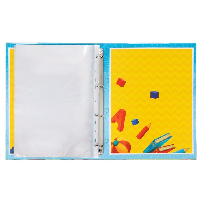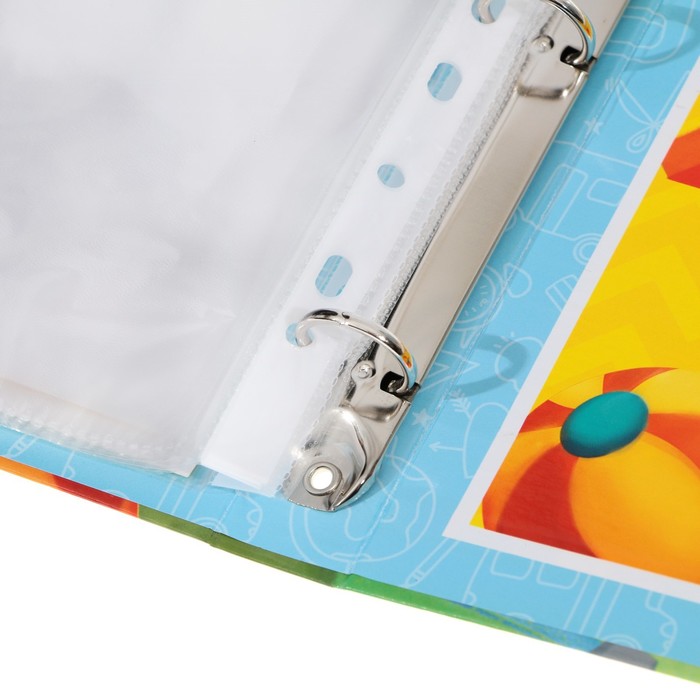 В набор входит: папка на кольцах, 6 односторонних листов-разделителей (мелованная бумага 157 гр/кв.м) и 6 файлов. Обложка выполнена из переплетного картона плотностью 1,5 мм, внутри есть четыре кольца, на которые следует цеплять файлы.