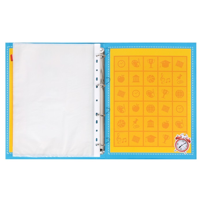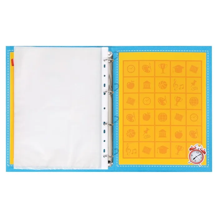 В набор входит: папка на кольцах, 10 односторонних листов-разделителей (мелованная бумага 157 гр/кв.м) и 10 файлов. Обложка выполнена из переплетного картона плотностью 1,5 мм, внутри есть четыре кольца, на которые следует цеплять файлы.