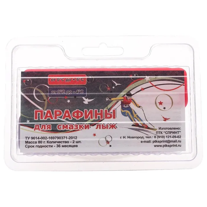 Парафин позволяет улучшить скоростные характеристики. По цвету бруска можно определить, для каких погодных условий он предназначен. Парафины подходят для сноубордов, а также пластиковых и деревянных лыж. На упаковке указаны и выделены цветом соответствующие температурные режимы.