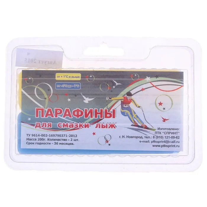 Парафин позволяет улучшить скоростные характеристики. По цвету бруска можно определить, для каких погодных условий он предназначен. Парафины подходят для сноубордов, а также пластиковых и деревянных лыж. На упаковке указаны и выделены цветом соответствующие температурные режимы.