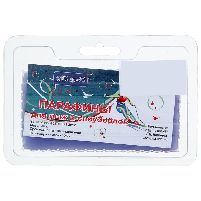 Парафин позволяет улучшить скоростные характеристики. По цвету бруска можно определить, для каких погодных условий он предназначен. Парафины подходят для сноубордов, а также пластиковых и деревянных лыж. На упаковке указаны и выделены цветом соответствующие температурные режимы.
