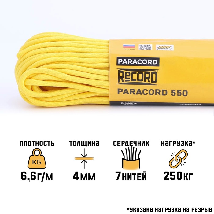 Паракорд 550, d=4 мм, 30 м, нейлон, желтый — Характеристики