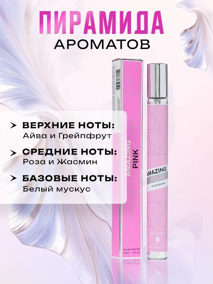 Композиция аромата Amazing Pink состоит из нот гиацинта, жасмина, лимона, древесины тикового дерева, ветивера, амбры и мускуса.