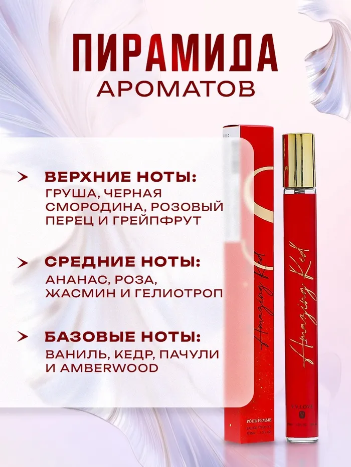 Захватывающий мощный аромат высшего класса открывается сладкими фруктовыми нотами сочной душистой груши, пьянящих ягод черной смородины и свежим утонченным аккордом розового перца. Роскошное цветочное «сердце» композиции мягко струится оттенками изысканного белого жасмина, чувственной бархатисто-пряной медовой розы и сладостным цветочно-ванильным акцентом гелиотропа, которые страстно сплетаются в шлейфовых нотах парфюма Amazing Red с теплыми мягкими сливочно-хвойными оттенками древесины белого кедра и восточной интригующей пряно-сладкой капелькой ванили.