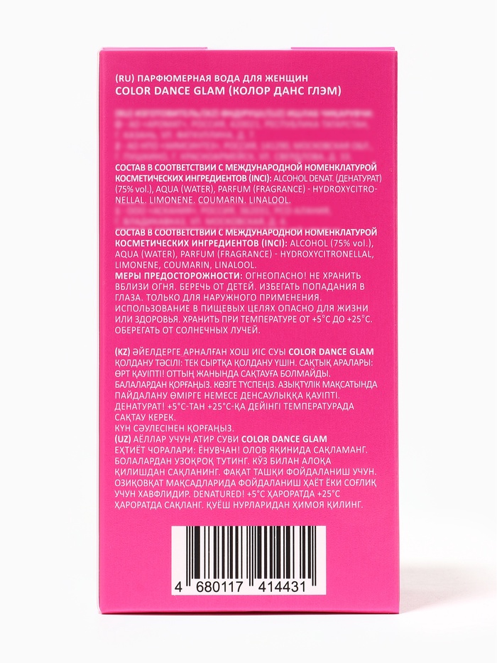 Туалетная вода COLOR Dance Glam — это совершенный союз дерзкой женственности и беззаботной лёгкости. Она адресована женщине, которая умеет блистать — как на вечеринке, так и на прогулке под вечерним небом. Этот аромат — словно приглашение ярко прожить момент: заметить, заворожить, оставить след.