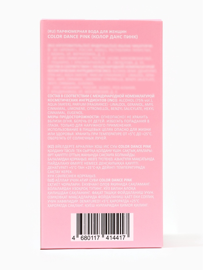 С первых мгновений Color Dance Pink раскрывается яркими и свежими нотами, создавая ощущение лёгкости, бодрости и весёлого настроения. В сердце аромата проявляются цветочные и фруктовые акценты, придающие композиции женственность, мягкость и утончённость. Базовые ноты создают лёгкий, стойкий и манящий шлейф, который подчёркивает индивидуальность и обаяние своей обладательницы.