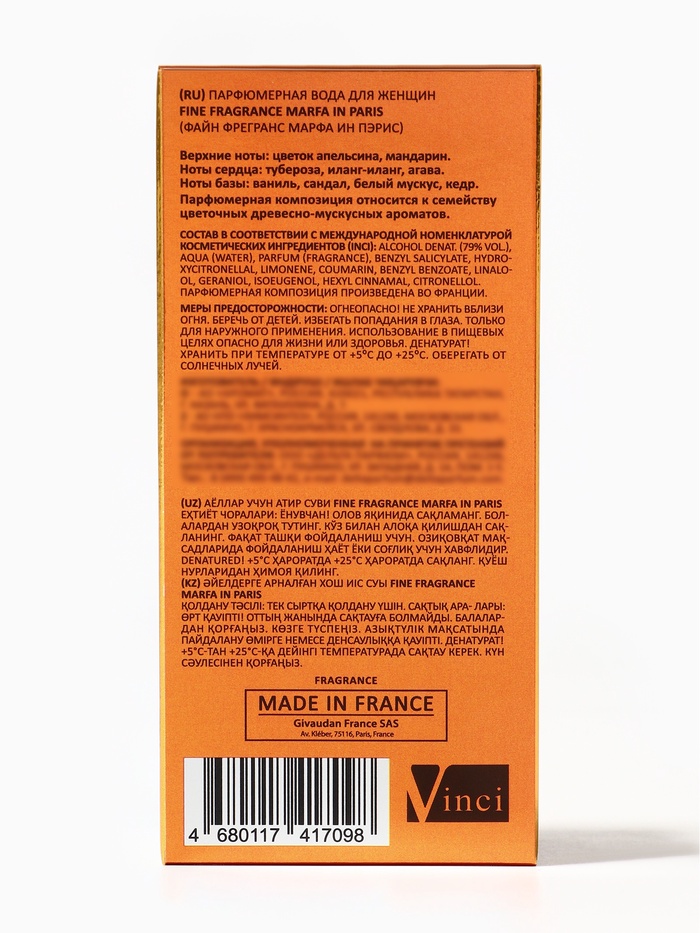 С первых мгновений Marfa In Paris раскрывается свежими и лёгкими нотами, создавая ощущение лёгкости, радости и элегантной уверенности. В сердце аромата проявляются нежные цветочные и фруктовые акценты, придающие композиции женственность, мягкость и утончённую соблазнительность. Базовые ноты создают стойкий, тёплый и манящий шлейф, подчёркивающий харизму и индивидуальность своей обладательницы.