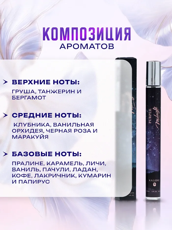 - Средние ноты: Клубника, Ванильная орхидея, Черная роза и Маракуйя;