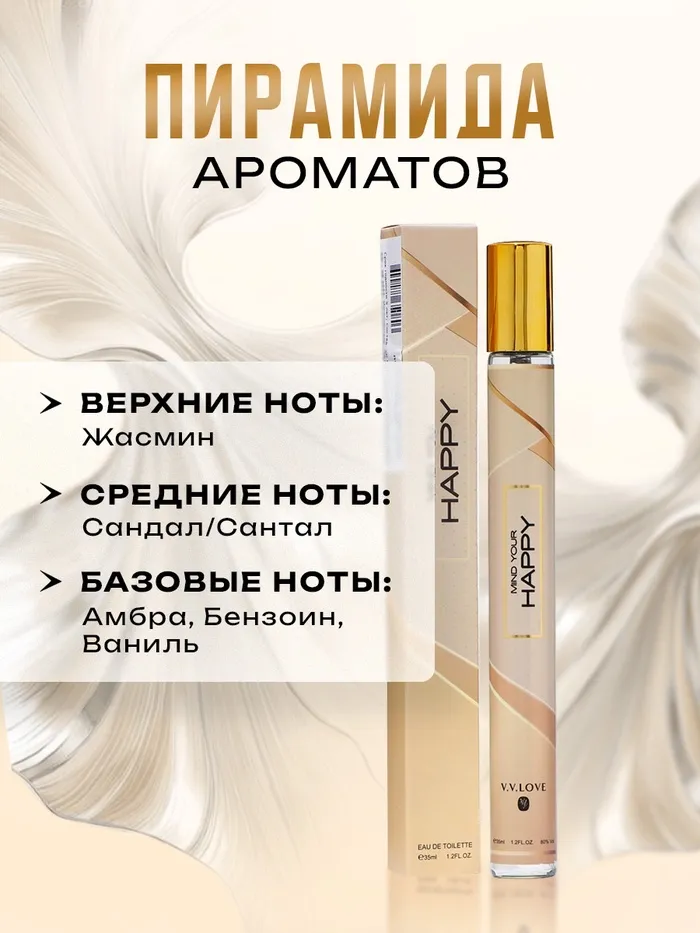 Парфюмерная композиция Mind You Happy открывается верхними нотами нежного жасмина, которые, спустя время, утопают в густом древесном аромате чувственного сандала в «сердце» букета. К концу дня композицию дополнит долгоиграющий и чувственный шлейф базовых аккордов: драгоценной амбры, смолянистого сиамского бензоина и пудровой ванили.