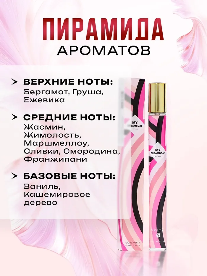 My Dreamboat— это стиль, роскошь и гламур. Парфюм выпущен для женщин как аромат восточной гурманской группы. Это запах молодых, стильных, современных девушек без комплексов, любительниц шумных вечеринок и ночных клубов. Такой аромат непременно привлечет внимание противоположного пола, он обладает особым магнетизмом и проникновенностью. Первые ноты аромата My Dreamboat привлекают лесной сладостью спелой ежевики, украшенной пикантным мерцанием цитрусово-пряных нот бергамота. Далее он манит за собой кокетливой и соблазнительной сладостью маршмеллоу, самобытными, фруктовыми акцентами смородины, нежно покрытыми ароматом взбитых сливок. Мягкости, игривости, нежности и чувственности композиции придает ласковый ароматный шлейф, сотканный из тончайших аккордов мускуса и ванили.