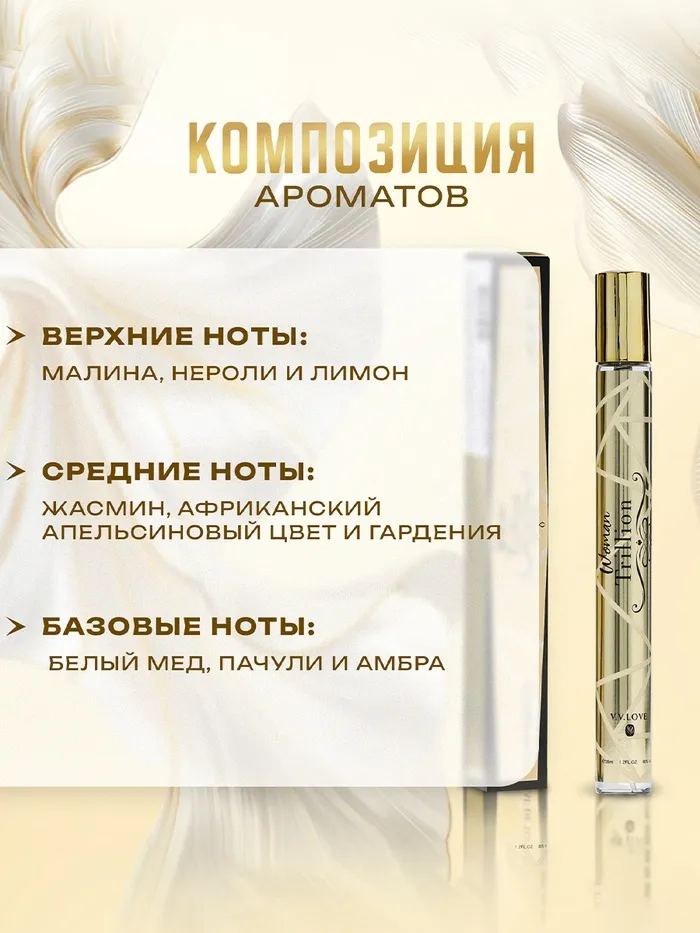 Дерзкий и нежный аромат перенесет Вас в мир желаний, искушений и фантазий. Women Trillion — это счастливый и желанный талисман, созданный для роковых красоток, очаровательных соблазнительниц и прекрасных обольстительниц, которых возносят и ценят, которыми восторгаются и восхищаются.