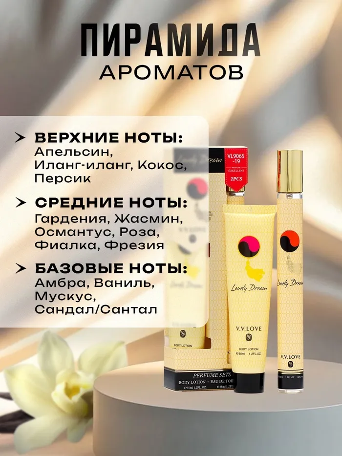 - Базовые ноты: ваниль, сандал, амбра и мускус.