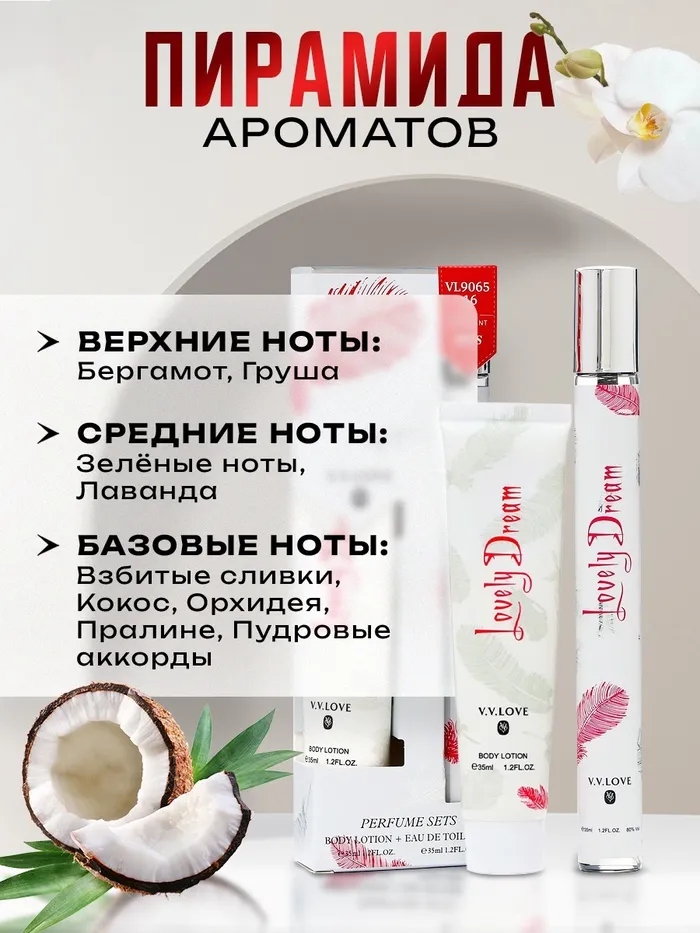 Роскошным лосьон для тела с чарующим ароматом подарит вам ощущение уверенности и сияния. Этот насыщенный кремовый лосьон разработан специально для женщин и обеспечивает длительное увлажнение и питание сухой кожи.Lovely Dream — прелестная женская парфюмерная вода со сладким цветочно-фруктовым ароматом. Аромат открывается свежими чистыми цитрусовыми аккордами бергамота, фруктовым акцентом сочной сладкой груши и бальзамно-свежими «зелеными» цветочными оттенками лаванды, которые гармонично смешиваются в соблазнительном «сердце» композиции с нежными пудровыми цветочными нотами экзотической ванильной орхидеи, сливочными сладкими оттенками кокоса, взбитых сливок и знаменитого пирожного пралине. Ненавязчивый обволакивающий шлейф парфюма Lovely Dream соткан из чувственных нот нежного мускуса и элегантных мягких древесных оттенков.