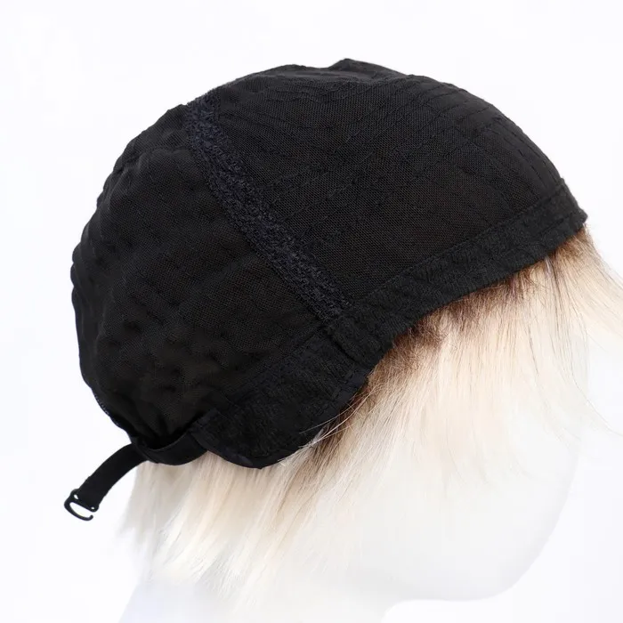 - Возьмите парик двумя руками и аккуратно натягивайте парик со стороны лба двигаясь к затылку. Откорректируйте размер парика с помощью специального крепления, выровняйте пробор, распределите чёлку.