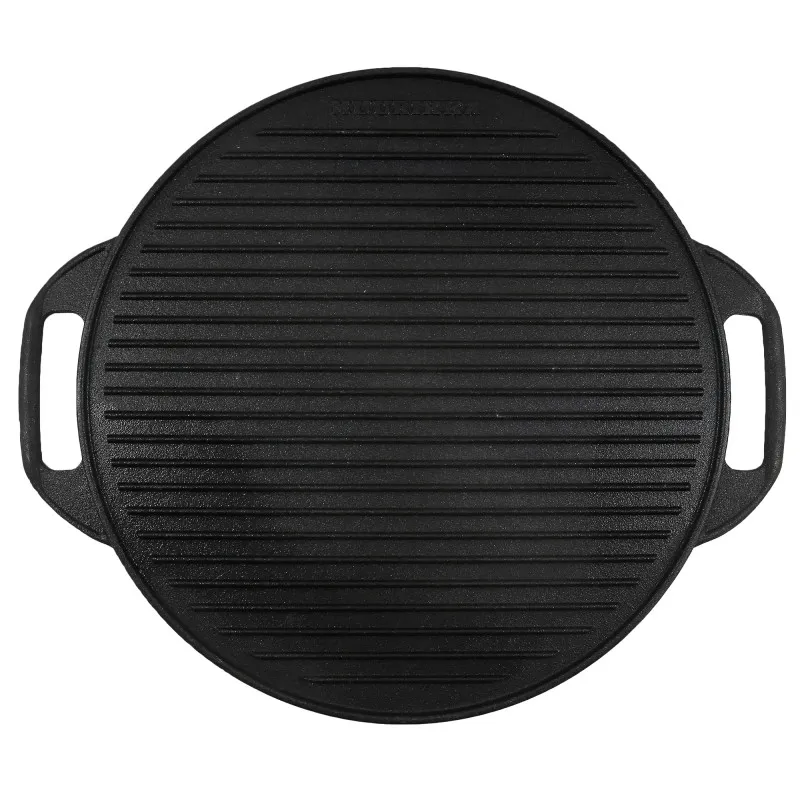 Качественная чугунная сковорода двусторонняя: на одной стороне получаются красивые полоски от гриля, а другая сторона гладкая. Универсальная сковорода подходит для открытого огня, газового или электрического гриля, и обладает отличными жарочными свойствами: температура остается постоянной, а сковорода выдерживает высокие температуры.