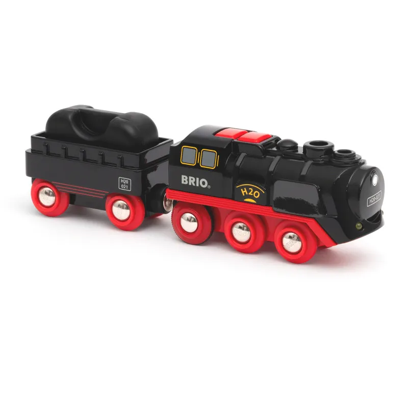 Brio Батарейный паровой поезд 33884 идет вперед на полной скорости! Поезд создает реалистичные паровые эффекты, когда он путешествует по железным дорогам BRIO World. Прикосновение к пару, выходящему из трубы поезда, совершенно безопасно. Если заканчивается вода, запасы можно легко пополнить из груза, который тянет поезд. При нажатии на красную кнопку на локомотиве загорается передний свет и снова начинает выходить пар.