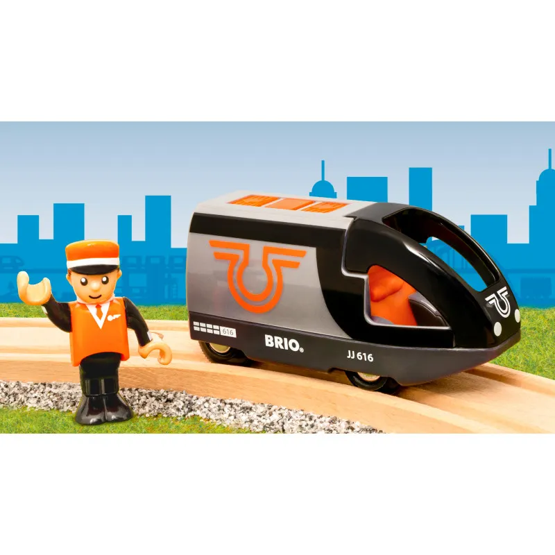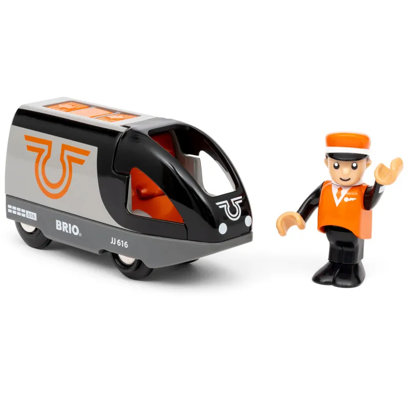 Батарейный пассажирский поезд Brio 36047 отправит вас в незабываемое путешествие по миру Brio! Современный черно-оранжевый локомотив оснащен удобными кнопками управления на крыше. Поезд может двигаться вперед и назад, а в передней части есть место для машиниста.
