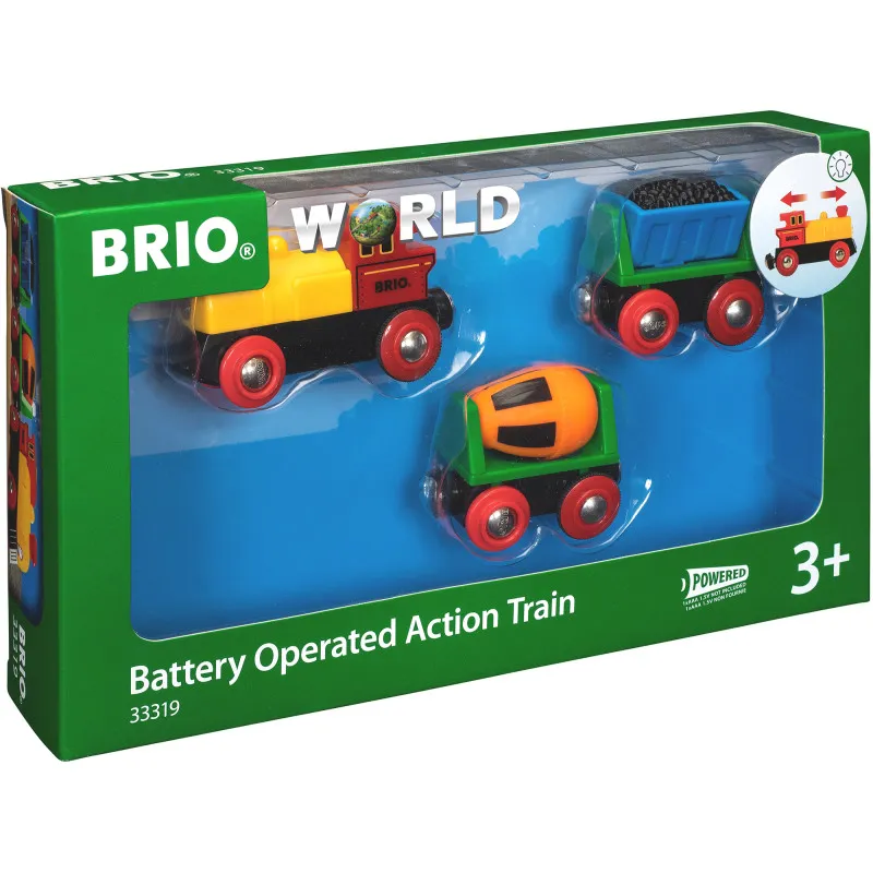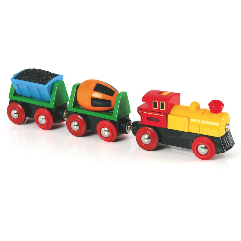 Батарейный игровой поезд Brio привносит новое дыхание в игру с железной дорогой! Желтый локомотив на батарейках тянет за собой вагон с углем и забавный вращающийся бетономешалку. Фары светят, когда поезд движется вперед.
