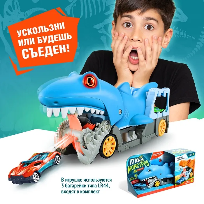 Парковка-автотрек «Атака монстров. Акула» — игровой комплекс в форме хищной рыбы. Акула-автовоз покорит ребёнка оригинальным дизайном, а автомобиль, который можно «пожирать» или выталкивать из хищника с помощью пусковой установки, подарит массу ярких эмоций.