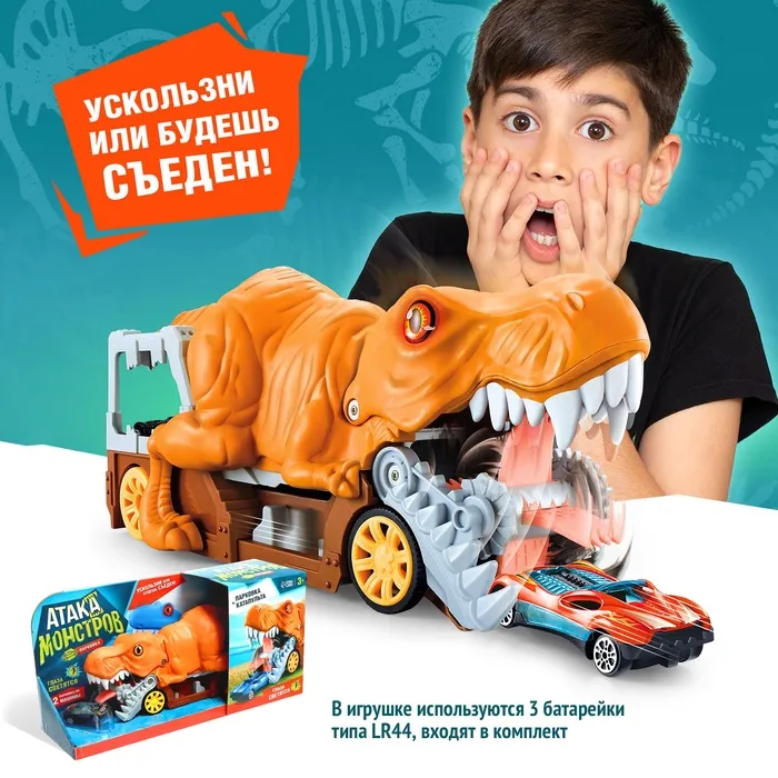 Парковка-автотрек «Атака монстров. Динозавр» — игровой комплекс в форме древнего хищника. Тирекс-автовоз покорит ребёнка оригинальным дизайном, а автомобиль, который можно «пожирать» или выталкивать из тираннозавра с помощью пусковой установки, подарит массу ярких эмоций.