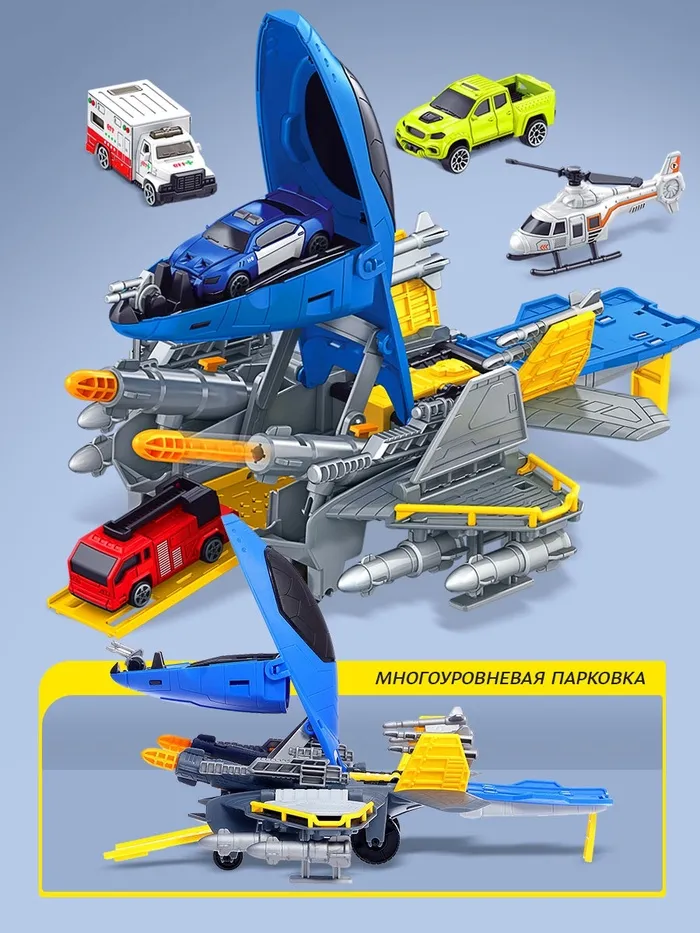 - Самолёт-парковка: стильный и вместительный, он трансформируется в игровую зону с гаражом для машинок, вертолётной площадкой и стреляющим оружием.