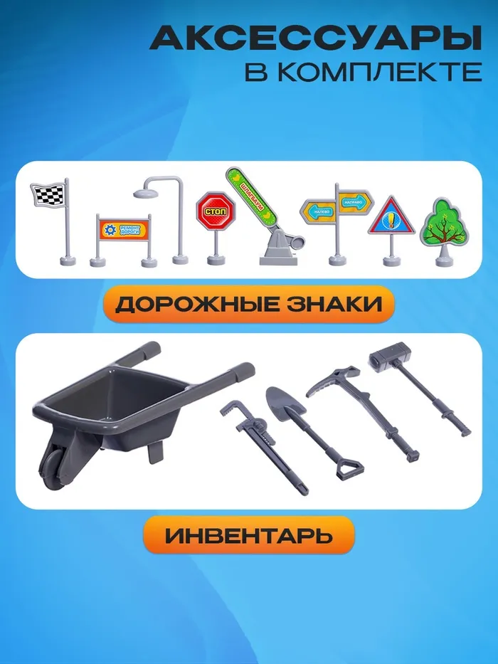 - Стимулирует творческое мышление: ребёнок придумывает сценарии и строит собственную стройплощадку.