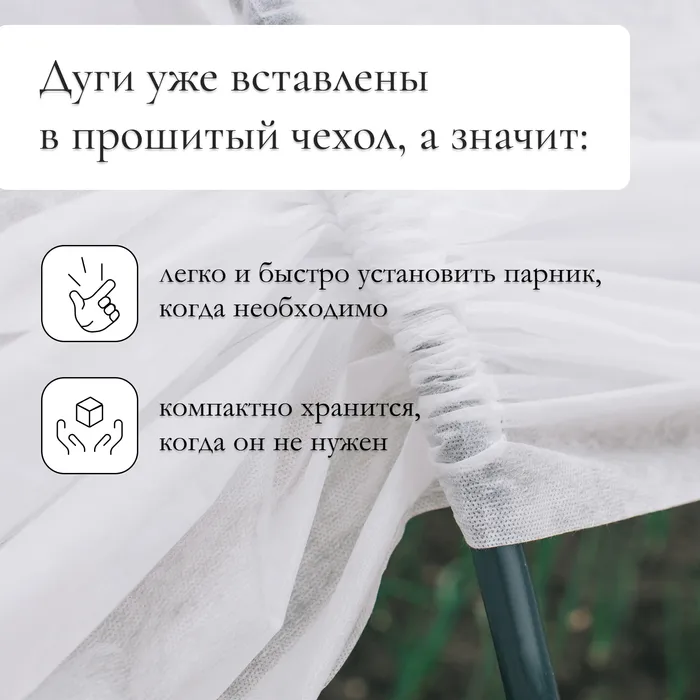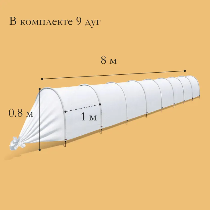 Парник прошитый, длина 8 м, 9 дуг из пластика, дуга L=2 м, d=20 мм, спанбонд 35 г/м², «Ленивый», с колышками и зажимами — Характеристики