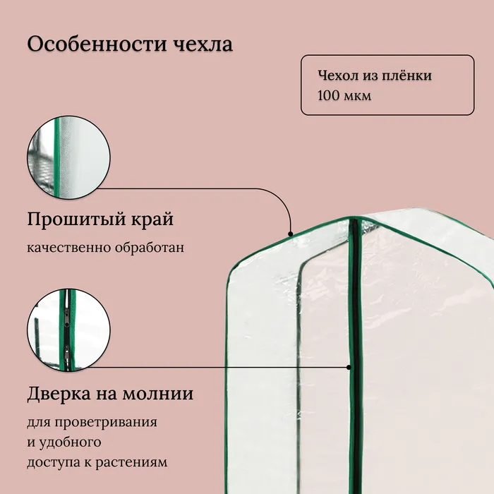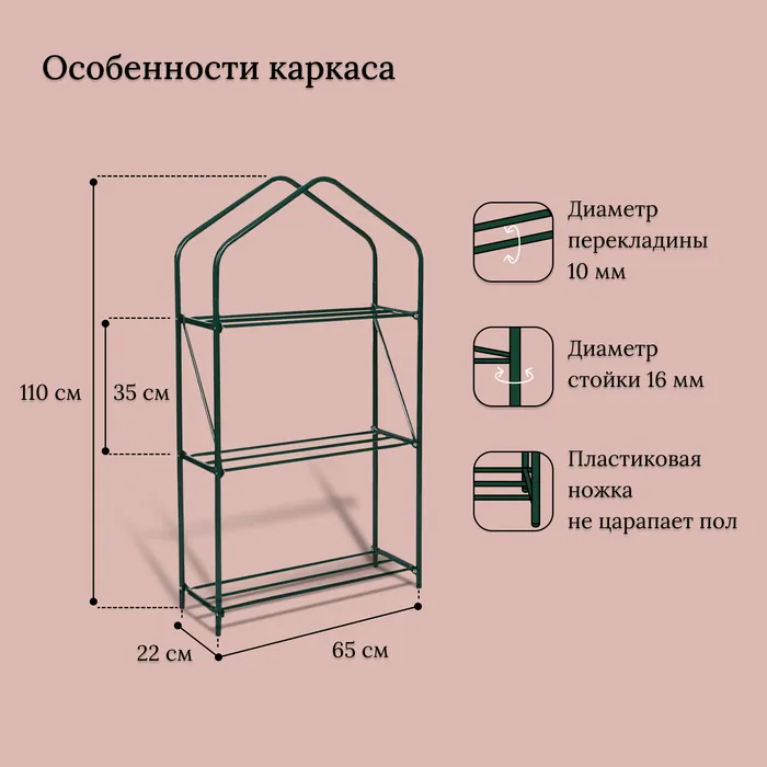 Парник-стеллаж, 3 полки, 110 × 65 × 22 см, металлический каркас d = 16 мм, чехол плёнка толщиной 100 мкм — Характеристики