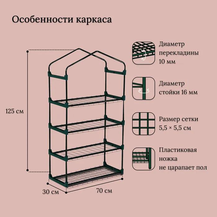 С таким стеллажем вы сможете возделывать свои любимые растения даже в прохладное время года. Плёнка создаст нужный уровень влажности и температуры, что значительно увеличит шансы на успешное прорастание семян и развитие растений. Это ваш зелёный уголок среди городского шума, где всегда весна!