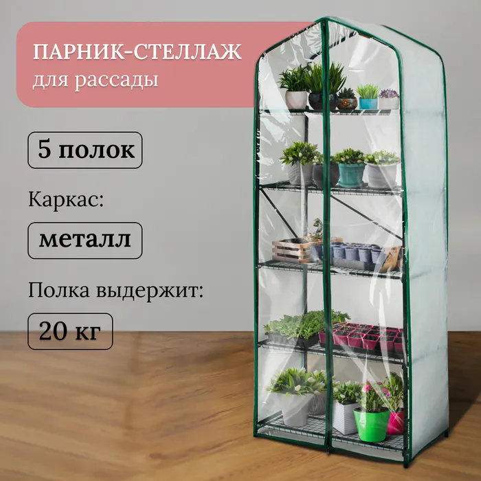 Парник-стеллаж, 5 полок, 190 × 65 × 40 см, металлический каркас d = 16 мм, чехол спанбонд 60 г/м², дверь из плёнки 100 мкм — Характеристики