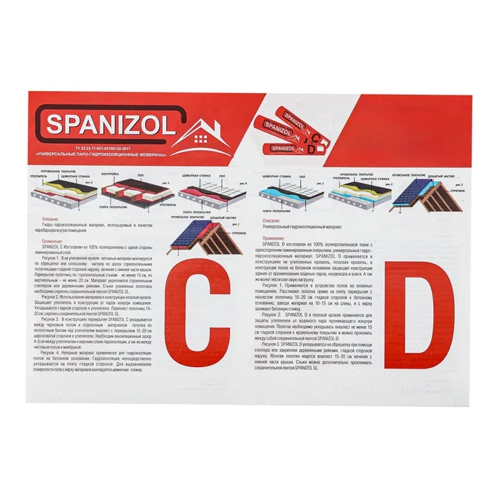 SpanIzol С (универсальная паро-гидроизоляция) - нетканное белое термоскрепленное полипропиленовое полотно (спанбонд) с ламинирующим слоем. Защищает утеплитель, стеновые, кровельные и другие элементы конструкций от насыщения водяными парами поступающими изнутри помещения. Используется в качестве гидроизоляции в неутепленных кровлях.