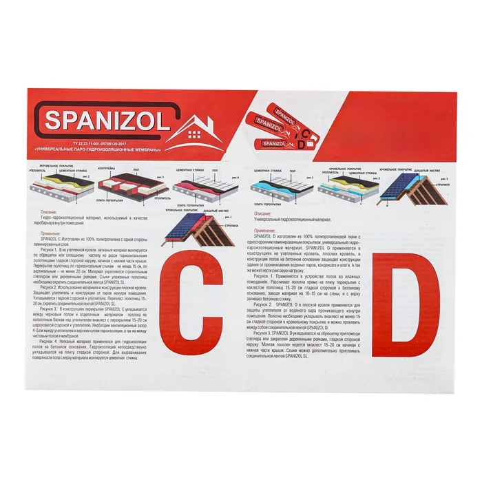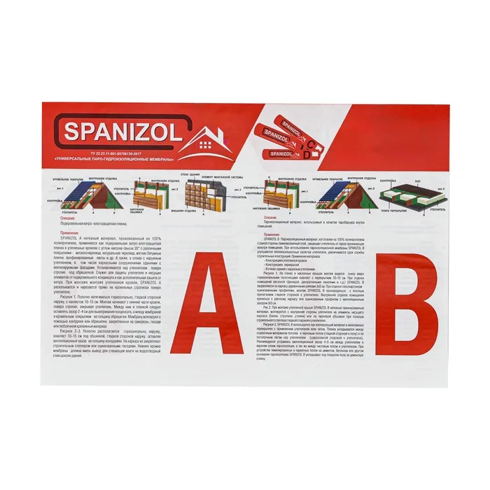 SpanIzol В (пароизоляция) - нетканное полипропиленовое термоскрепленное белое полотно (спанбонд) с ламинирующим слоем. Защищает утеплитель, стеновые, кровельные и другие элементы конструкций в зданиях всех типов от насыщения водяными парами поступающими изнутри помещения.