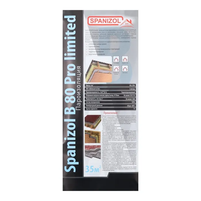 SpanIzol В максимальной (из серии) плотности (усиленная пароизоляция) - нетканное белое термоскрепленное полипропиленовое полотно (спанбонд) с ламинирующем слоем. Защищает утеплитель, стеновые, кровельные и другие элементы конструкций в зданиях всех типов, от насыщения водяными парами поступающих изнутри помещения.