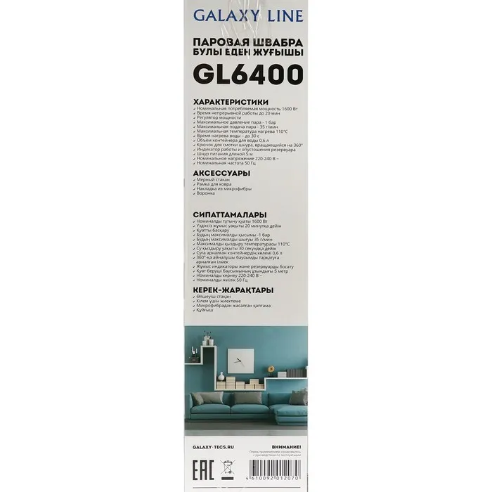 Паровая швабра Galaxy LINE GL 6400, 1600 Вт, 600 мл, 35 г/мин, шнур 5 м, чёрная — Характеристики