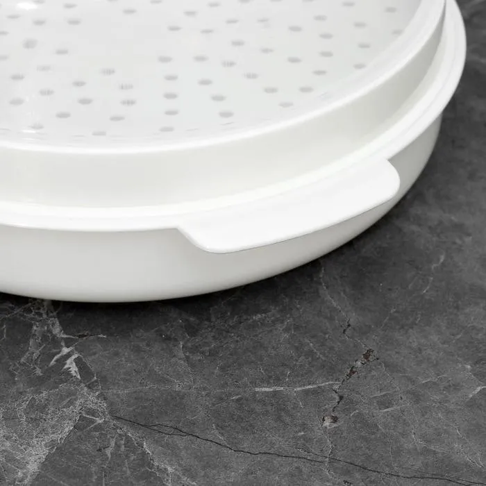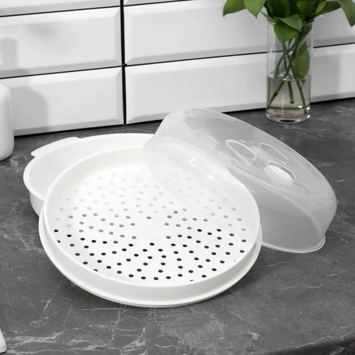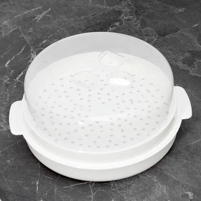 Малый размер пароварки позволит готовить в любой существующей модели СВЧ, а так же экономит место на кухне. Каждую её часть можно использовать, как самостоятельную посуду. Пластик не нагревается, что обезопасит процесс использования. Она легко моется и не сохраняет посторонние запахи.