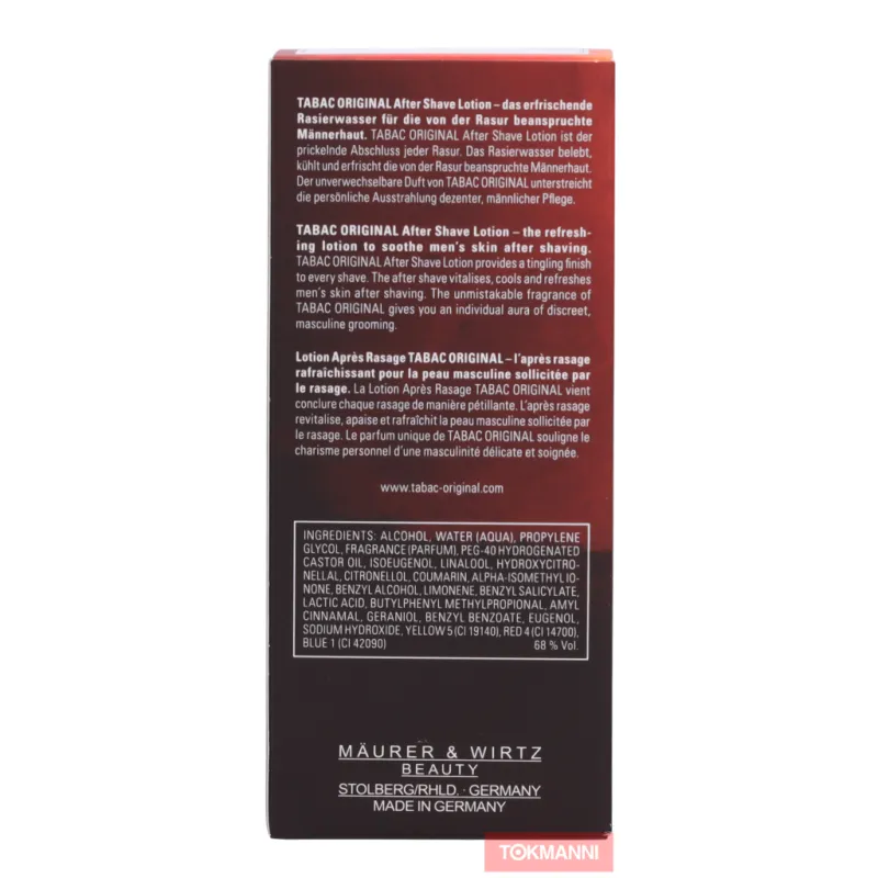 Лосьон после бритья Tabac Original освежает лицо после бритья. Обладает мужественным, ясным, пряным ароматом. Экономичная упаковка объемом 100 мл. Мы постоянно обновляем информацию о продуктах, но рекомендуем всегда проверять данные на упаковке.