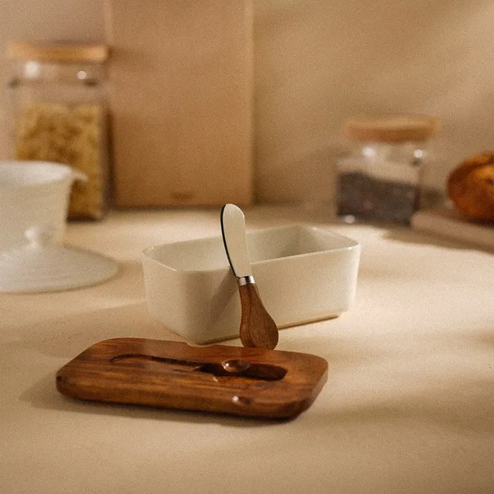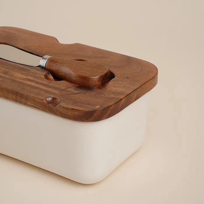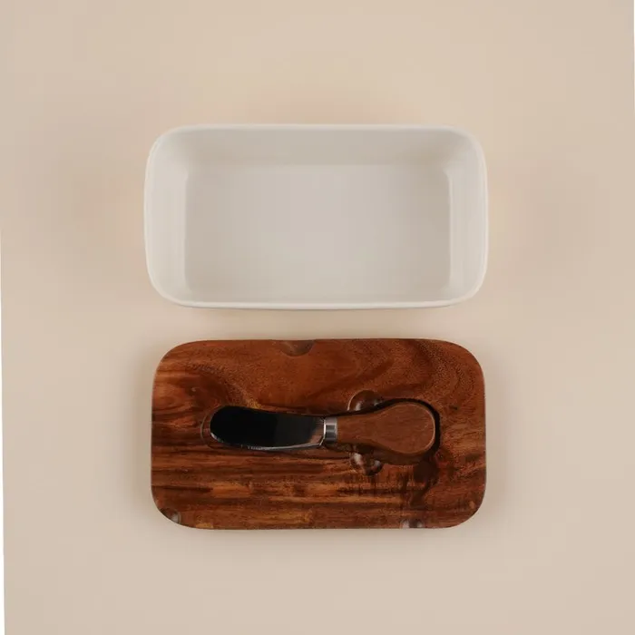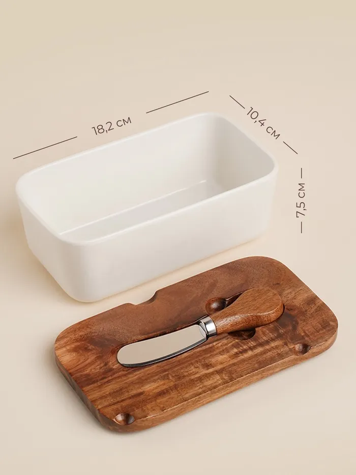 Создавайте красивые закусочные композиции с набором из фарфоровой паштетницы и ножа. Белоснежная прямоугольная форма объёмом 650 мл удобна для сервировки паштетов, сыров и соусов, а деревянная крышка сохраняет свежесть продуктов. В комплекте нож длиной 12.3 см для аккуратной нарезки.