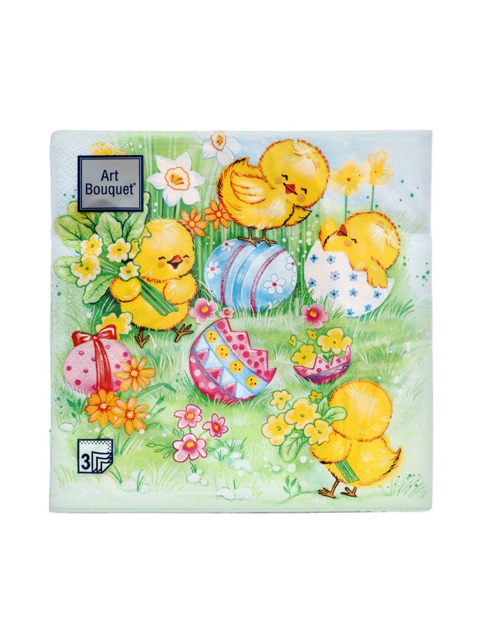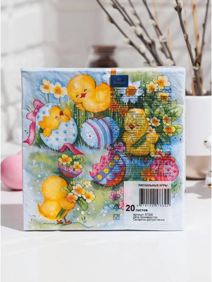 Пасхальные сервировочные бумажные салфетки Art Bouquet с рисунком «Пасхальные игры» - это отличное украшение для вашего праздничного стола. Идеально подойдут как для сервировки, так и в качестве декора и украшения в домашних условиях или на больших мероприятиях. Праздничные салфетки с пасхальным рисунком будут хорошим подарком для родных и близких. Данные салфетки можно использовать так же для декупажа и коллажей.