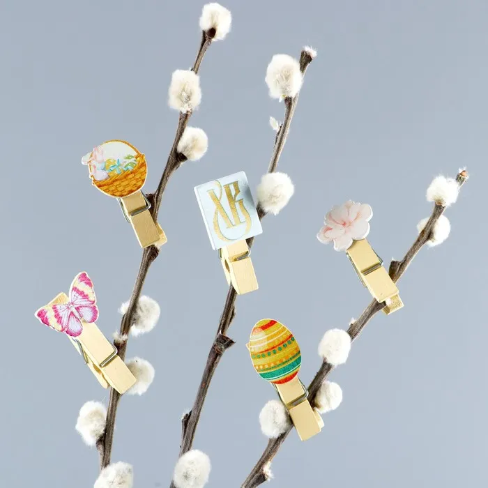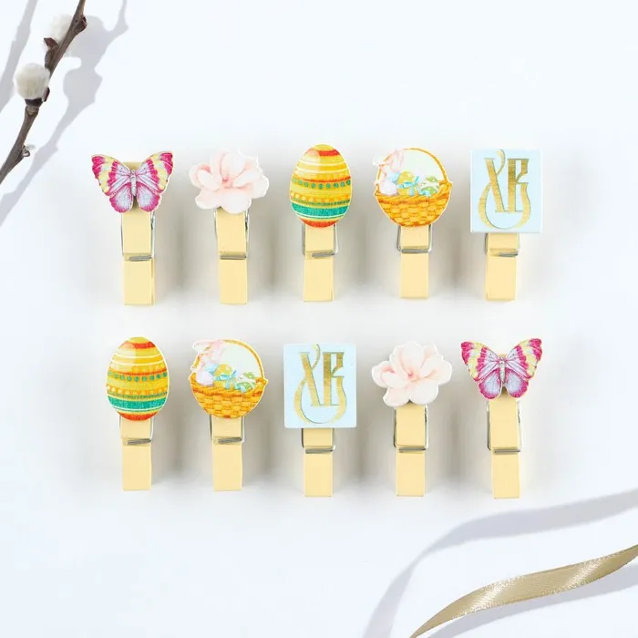 - это декоративный элемент, который станет незаменимым помощником в подготовке к празднику Пасхи. Изготовленные из дерева, прищепки отличаются своей прочностью и долговечностью. - Разноцветный дизайн декора на прищепках делает их яркими и привлекательными, что позволяет создать праздничное настроение и атмосферу. - В комплекте идет 10 прищепок, что позволяет украсить большое количество верб. - Вес набора составляет всего 20 грамм, что делает его легким и удобным для использования. - Набор прищепок для украшения вербы «ХВ» станет отличным выбором для тех, кто хочет создать праздничное настроение и украсить свой дом к Пасхе.