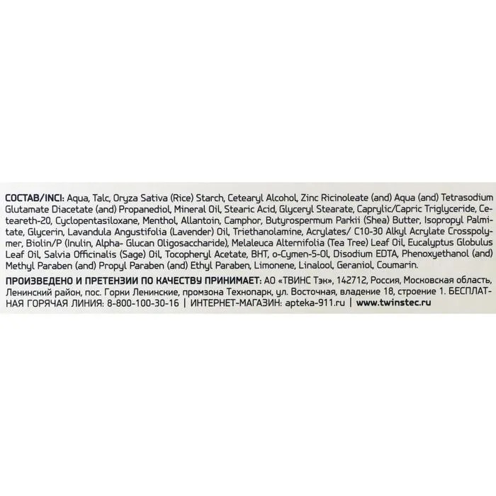 Состав: Aqua, Talc, Oryza Sativa (Rice) Starch, Cetearyl Alcohol, Zinc Ricinoleate (and) Aqua (and) Tetrasodium Glutamate Diacetate (and) Propanediol, Mineral Oil, Stearic Acid, Glyceryl Stearate, Caprylic/Capric Triglyceride, Ceteareth-20, Cyclopentasiloxane, Menthol, Allantoin, Camphor, Butyrospermum Parkii (Shea) Butter, Isopropyl Palmitate, Glycerin, Lavandula Angustifolia (Lavender) Oil, Triethanolamine, Acrylates/ C10-30 Alkyl Acrylate Crosspolymer, Biolin/P (Inulin, Alpha- Glucan Oligosaccharide), Melaleuca Alternifolia (Tea Tree) Leaf Oil, Eucalyptus Globulus Leaf Oil, Salvia Officinalis (Sage) Oil, Tocopheryl Acetate, BHT, o-Cymen-5-OL, Disodium EDTA, Phenoxyethanol (and) Methyl Paraben (and) Propyl Paraben (and) Ethyl Paraben, Limonene, Linalool, Geraniol, Coumarin.
