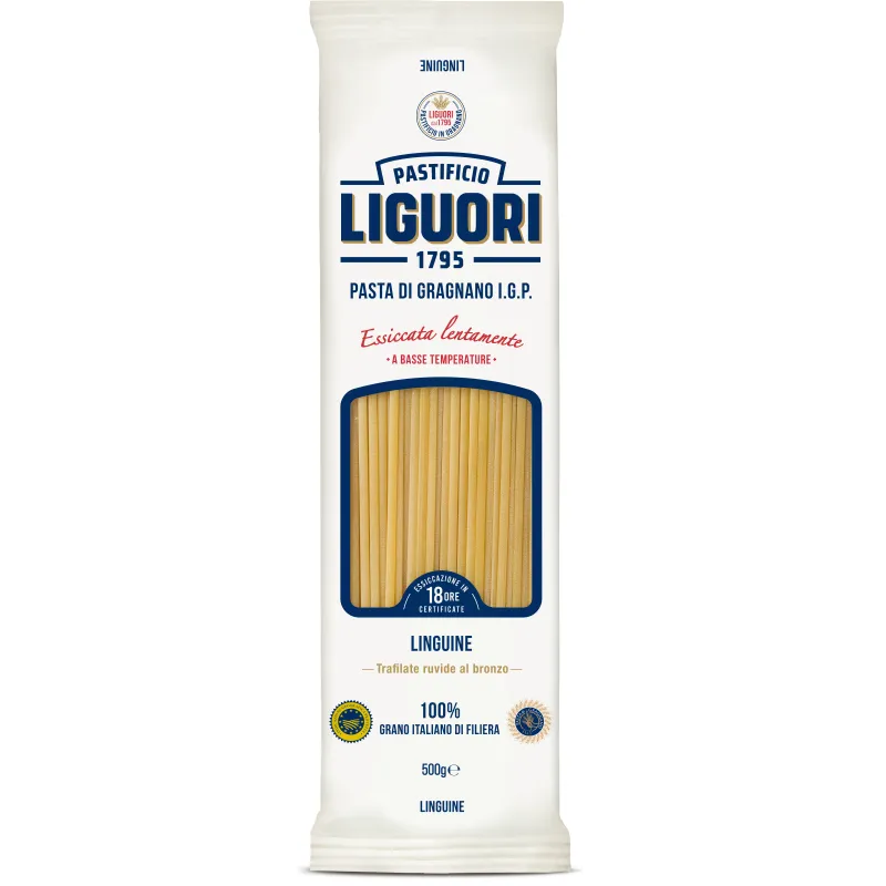 Макароны Лингвини получили своё название благодаря плоской форме, напоминающей язык. Эта спагетти в уплощенной версии имеет прямоугольную форму. Часто используется, например, с морепродуктами. Время приготовления 11 минут.