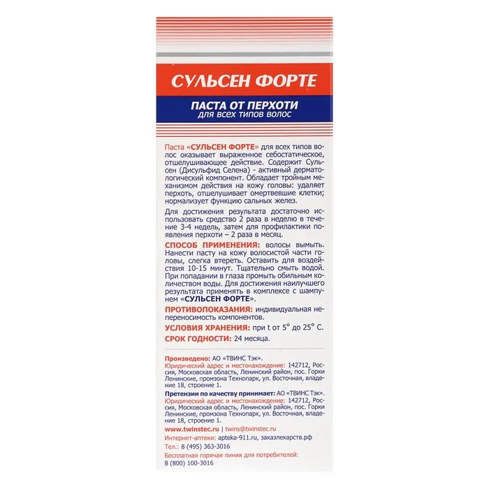 Паста «Сульсен форте» для всех типов волос оказывает выраженное себостатическое, отшелушивающее действие. Содержит Сульсен (Дисульфид Селена) - активный дерматологический компонент. Обладает тройным механизмом действия на кожу головы: удаляет перхоть, отшелушивает омертвевшие клетки, нормализует функцию сальных желез. Для достижения результата достаточно использовать средство 2 раза в неделю в течение 3-4 недель, затем для профилактики появления перхоти – 2 раза в месяц.